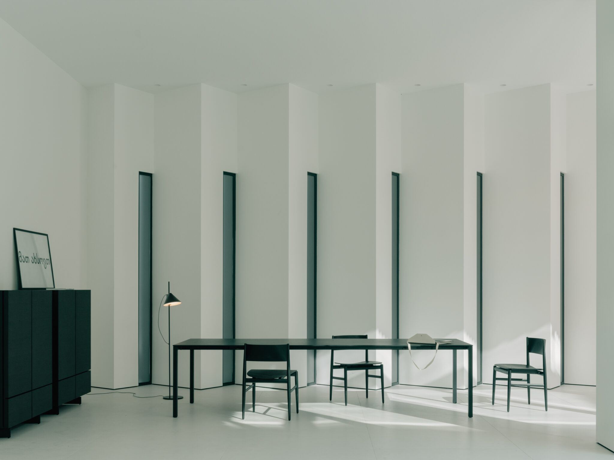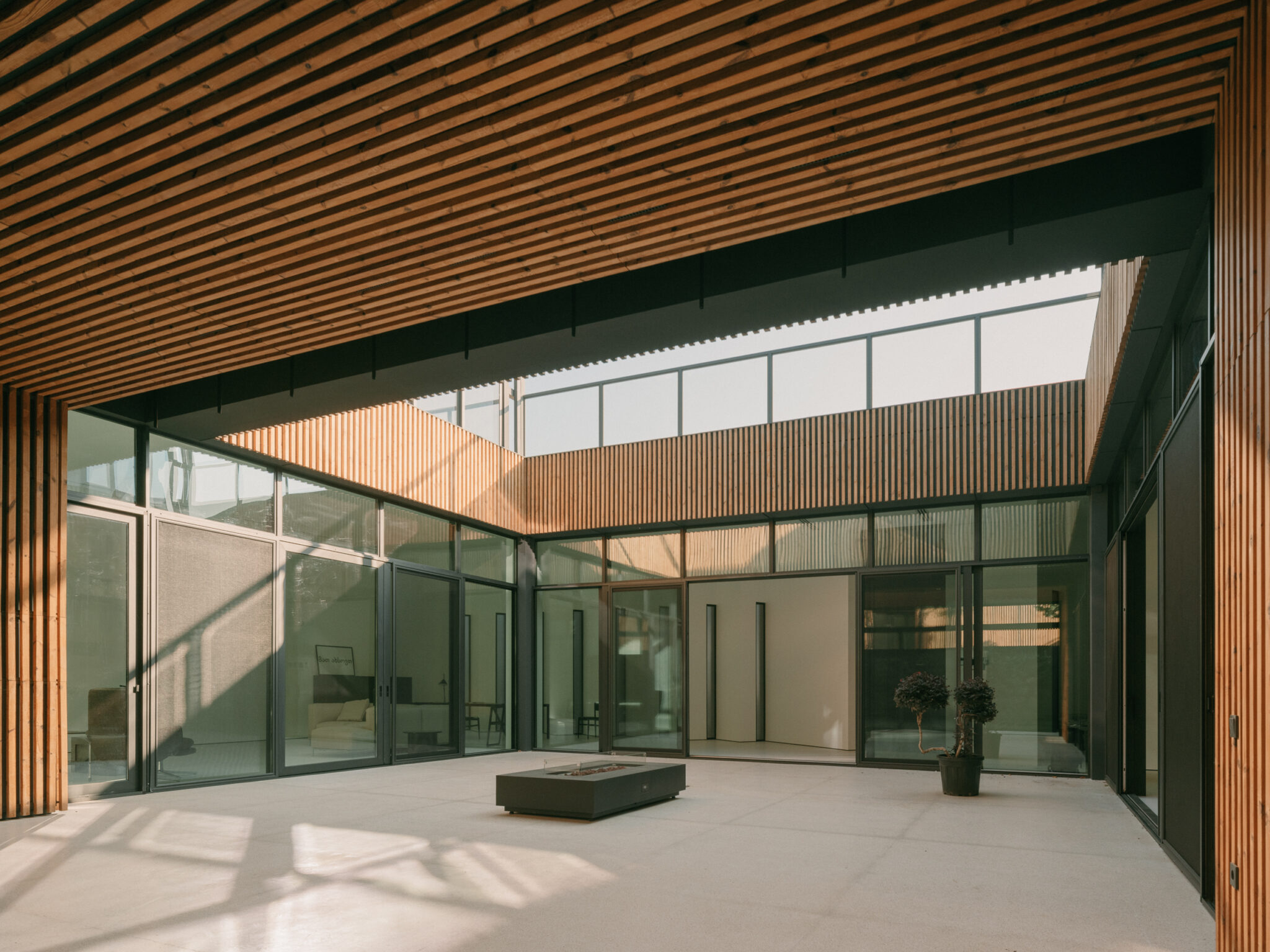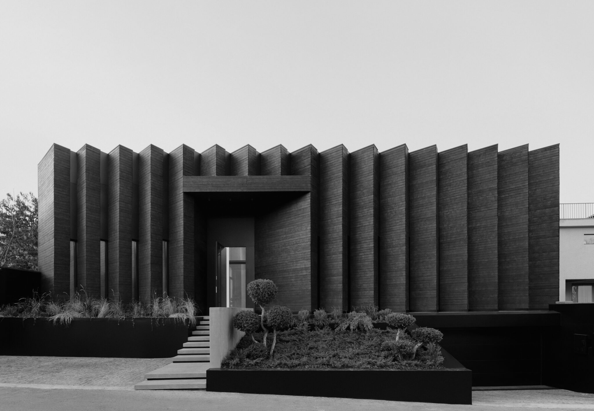 Materiality reinforces the project’s inverted logic. The façade facing the street is clad in charred wood, a traditional technique historically used to protect timber from weathering. Here, it forms a dense and protective outer shell. Inside the courtyard, this dark envelope gives way to natural, untreated wood, introducing warmth, texture, and tactility. The interior spaces are finished entirely in white, allowing light, proportion, and spatial relationships to define the atmosphere. This gradual transition—from charred wood to natural timber to abstract white—creates a sequence of spatial dematerialization, emphasizing the movement from exterior to inner core.