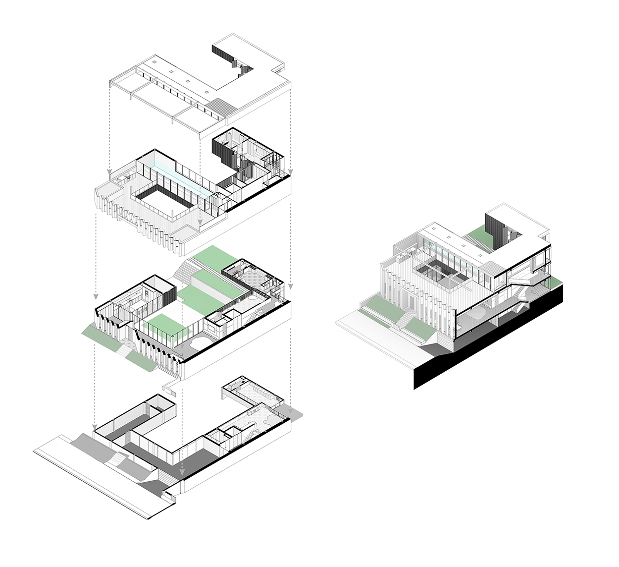 The main living spaces—entrance hall, living room, and kitchen—are oriented toward the inner courtyard, transforming it into an open-air central hall. A suspended swimming pool spans across this void, creating a covered outdoor space below while visually connecting the upper levels. Sectionally, the building rises to three floors at the rear and appears as a single-story volume toward the street. This variation allows for a double-height living area and the insertion of intermediate half-levels, generating a gradual and fluid spatial sequence.