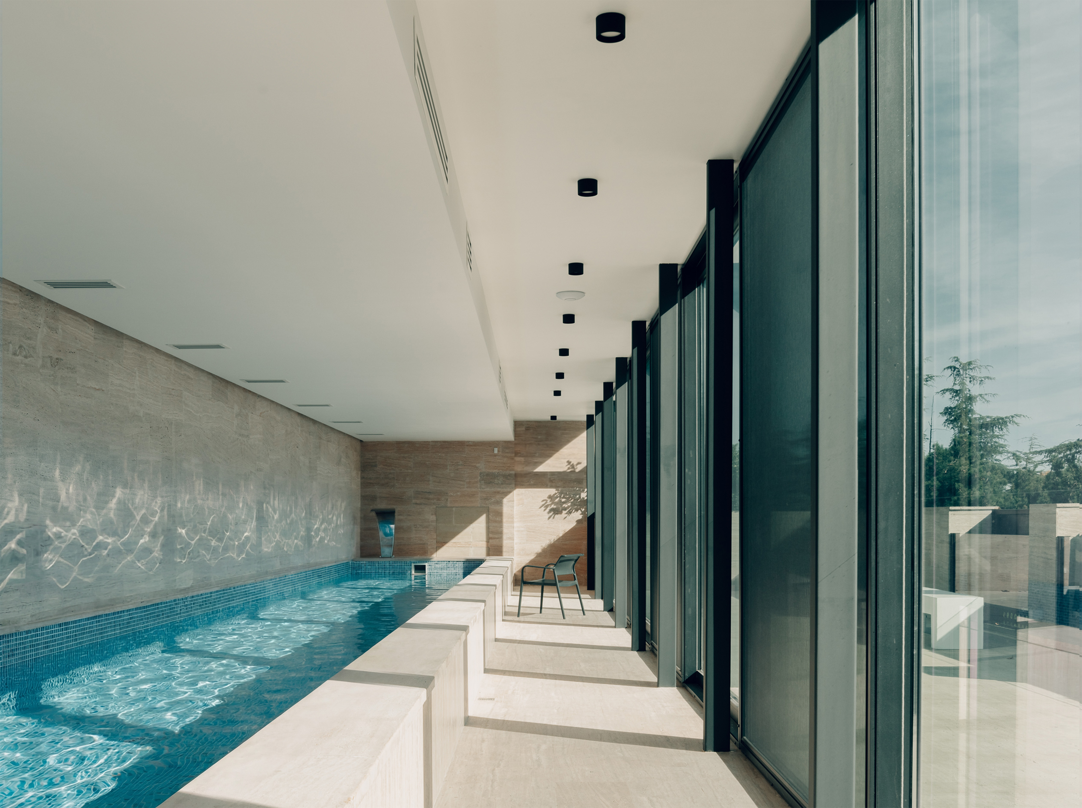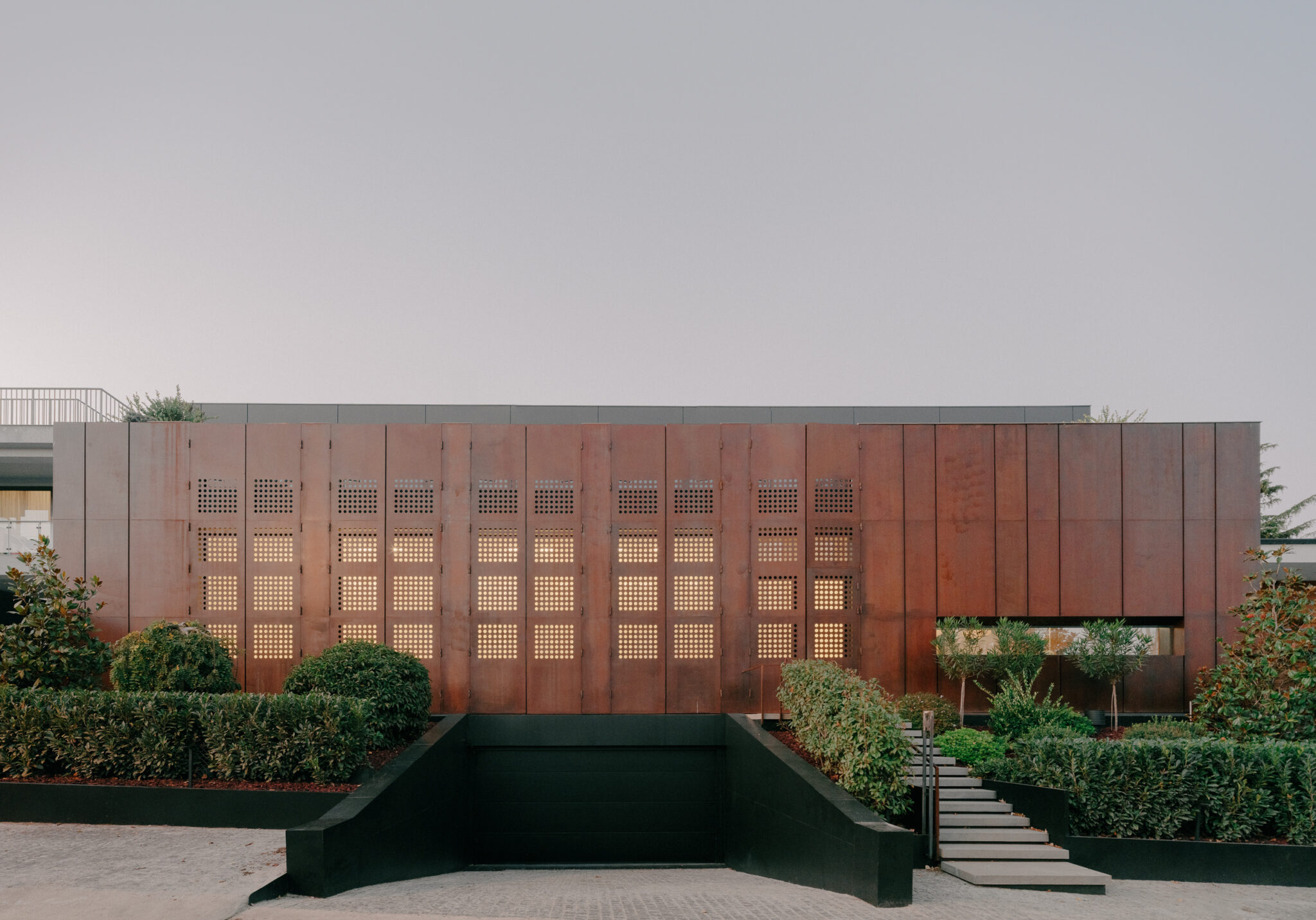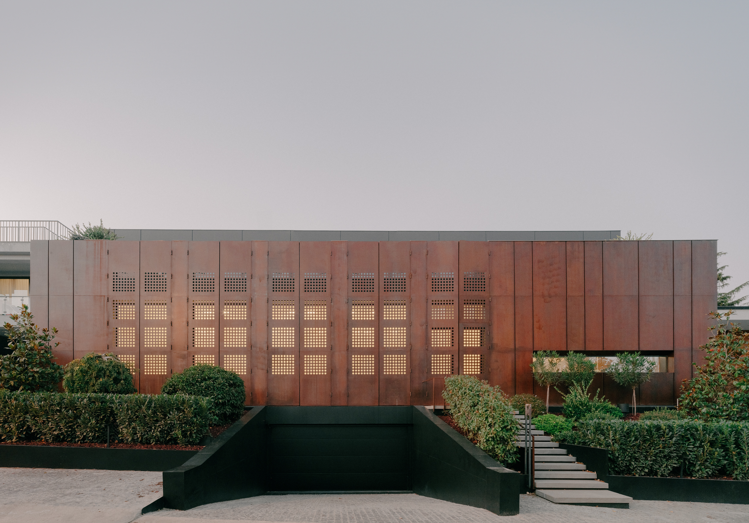 The interior is conceived as a calm, light-filled counterpoint to the protective exterior envelope, unfolding as a continuous sequence of spaces oriented toward the garden and the indoor pool. Daylight penetrates deep into the plan through large glazed openings, while the perforated metal façade is perceived from within as a delicate layer of filtered light. The resulting pattern of soft shadows animates walls and floors throughout the day, giving the otherwise restrained spaces a subtle sense of movement and temporality.