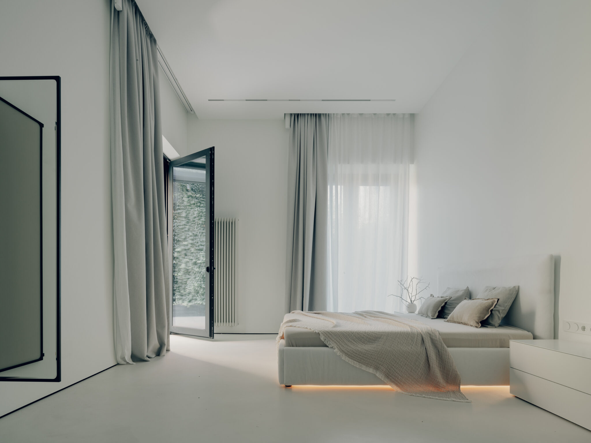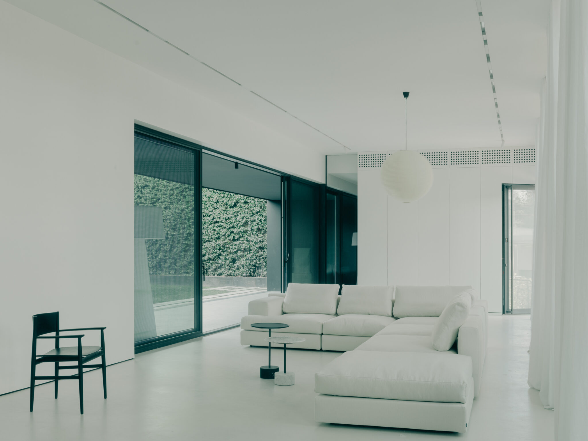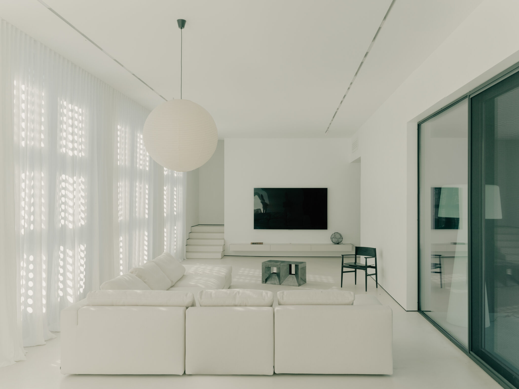 A minimal material palette reinforces clarity and spatial continuity. White surfaces, integrated furnishings, and precise detailing create a neutral backdrop where proportion and light define the atmosphere, while the indoor pool introduces a reflective, atmospheric dimension at the heart of the house. Circulation zones are treated as quiet transitions between more public living areas and private rooms, establishing a fluid progression that balances openness with a sense of calm enclosure.