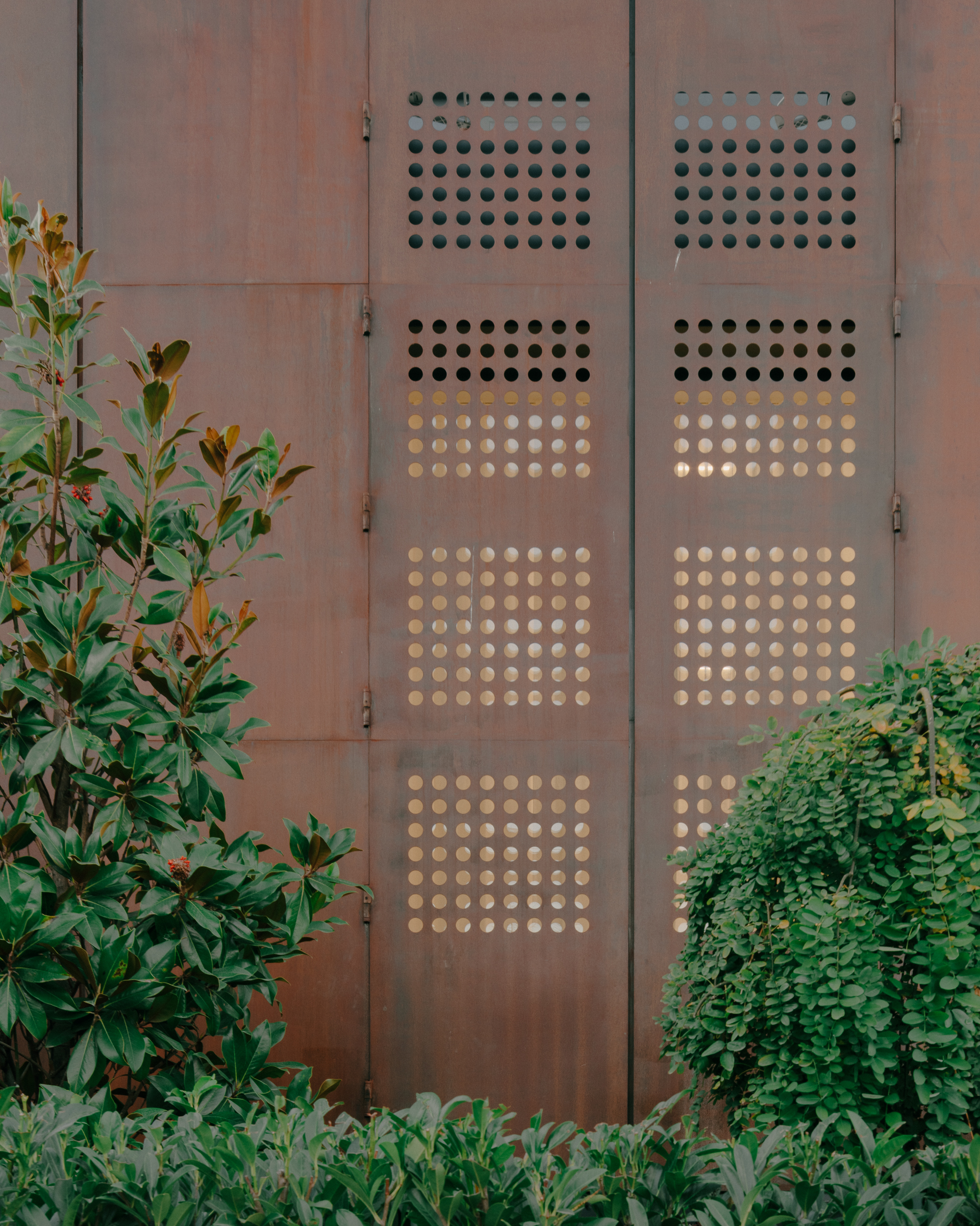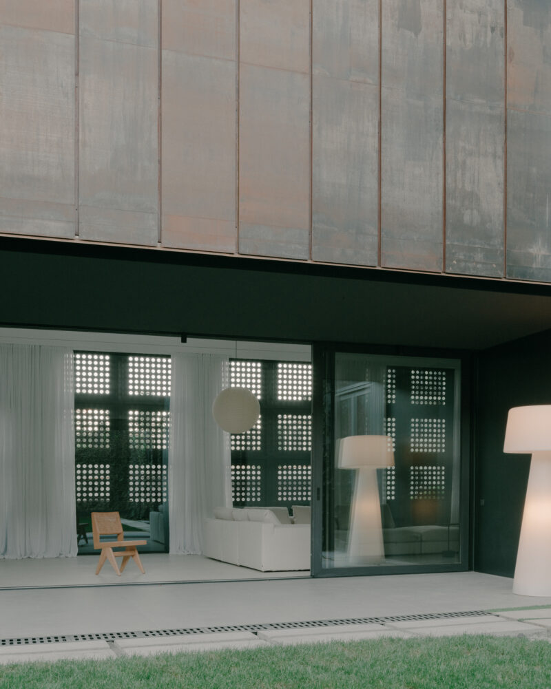 The courtyard forms the quiet heart of the house, a protected outdoor room enclosed by the permeable metal envelope. Shielded from the street yet open to the sky, it establishes a calm micro-landscape where vegetation, light, and seasonal change become integral to everyday life. Climbing greenery softens the architectural boundary, creating a tactile contrast between the living surface of the garden and the precise geometry of the surrounding walls.