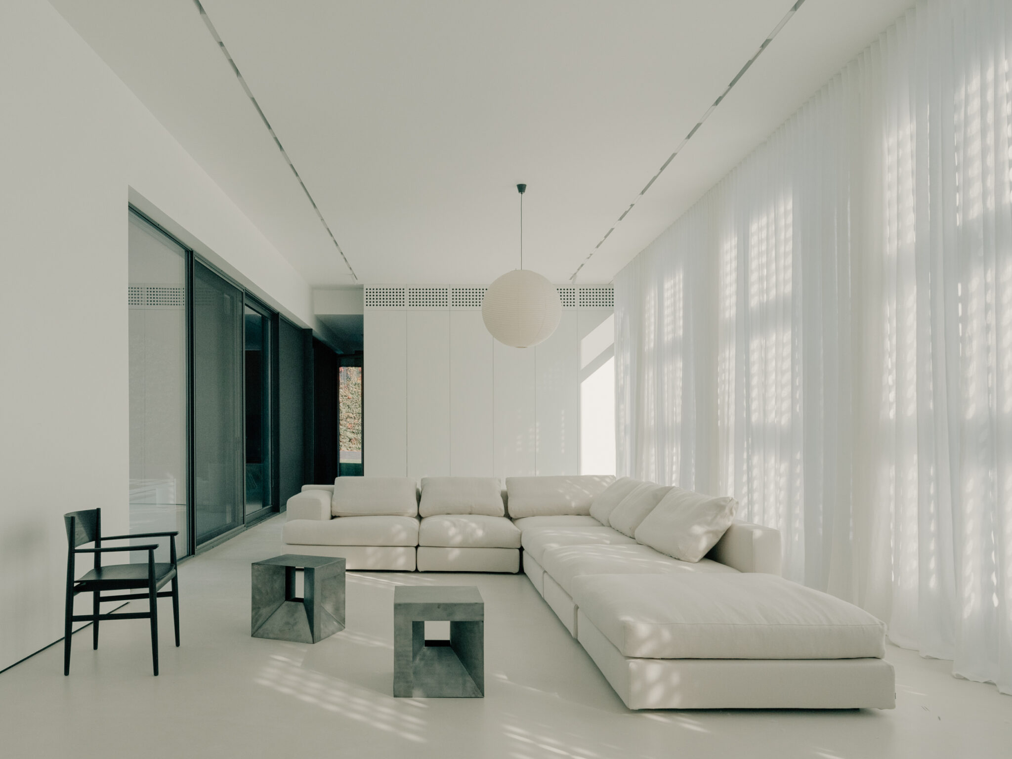 Functioning as both spatial and atmospheric core, the courtyard organizes circulation and frames views from the interior, allowing natural light and fresh air to permeate the dwelling. Throughout the day, filtered sunlight and shifting shadows animate the surfaces, reinforcing the sense of enclosure while maintaining a visual connection to the outdoors. In this way, the courtyard operates as a transitional realm — neither fully inside nor outside — grounding the house in a serene, introspective landscape.